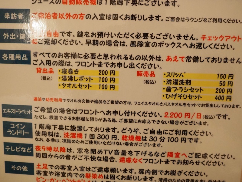 またチェックアウトは10時までで、時間を過ぎると1時間(切上げ)1000円かかりますので、時間にルーズな方には向かないかもしれません。