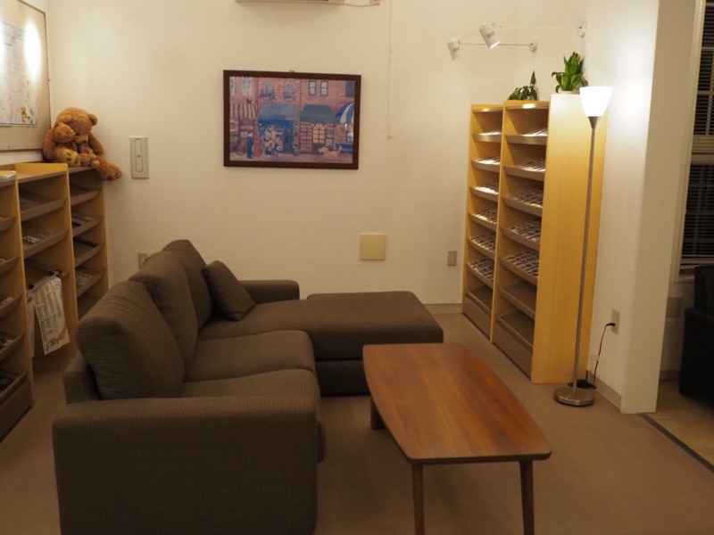 建物の一階には共用スペースがあり、チェックインカウンターやロビーがあります。
