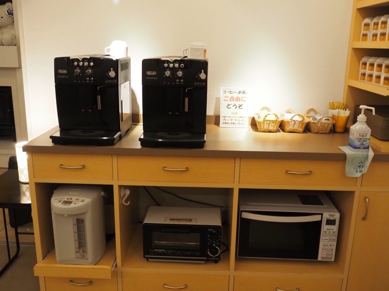 ロビーには共用のコーヒーサーバーや電子レンジ、オーブントースター、ポットがありますので、冷凍食品の調理も可能です。