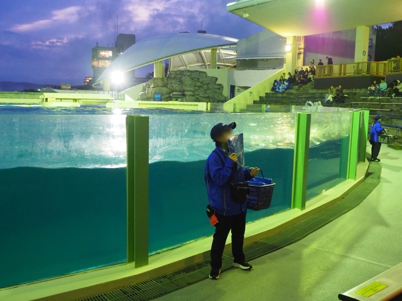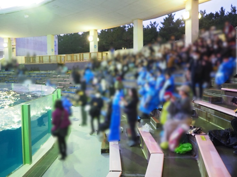 普段はとても混み合うシャチパフォーマンスですが、平日夜、しかも数量限定ということもあってかとても空いていました。