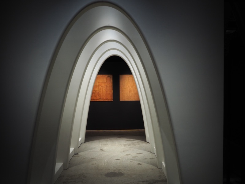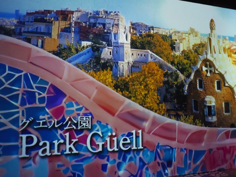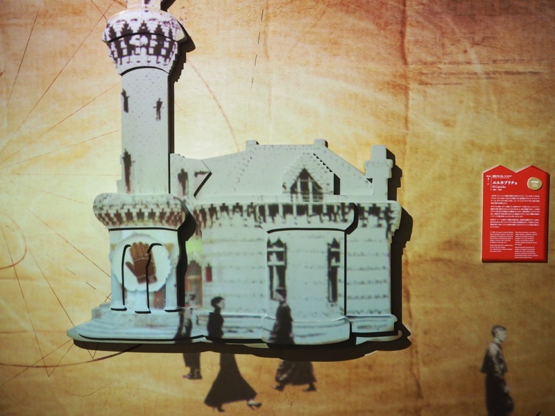 まず映え確定の建築物紹介通路、ここには若かりし日のガウディの建築物が壁に映し出されています。